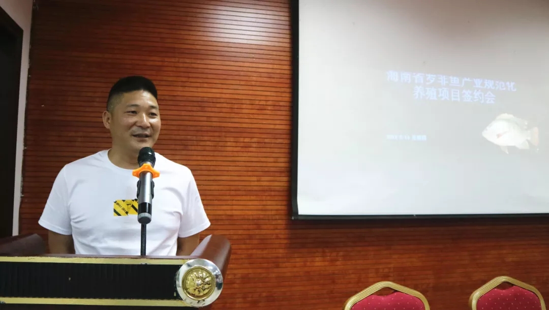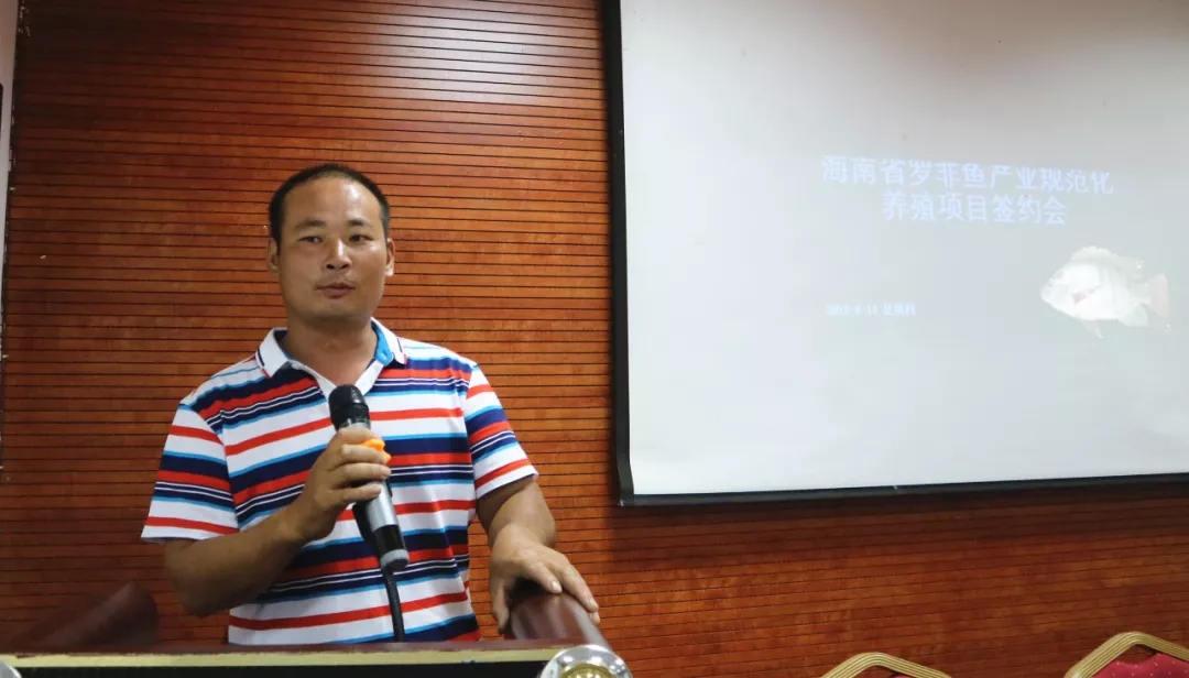 養(yǎng)殖戶代表徐勇建先生上臺做了發(fā)言,說道我們養(yǎng)殖戶文化水平不高,我們十分愿意參加海南省羅非魚產(chǎn)業(yè)規(guī)范化養(yǎng)殖項目,希望項目參與企業(yè)能多多對我們進行指導和幫助。感謝促進會不辭勞苦為我們海南羅非魚養(yǎng)殖戶所做的努力,我們是親眼見證了促進會一趟又一趟到我們的魚塘與我們逐條討論項目條款和活動目標,一次又一次在政府、企業(yè)和科研機構中為我們養(yǎng)殖戶爭取權益,在這里感謝促進會,為我們做了這么多,我們一定會全力配合項目的開展,養(yǎng)出最好的海南羅非魚。