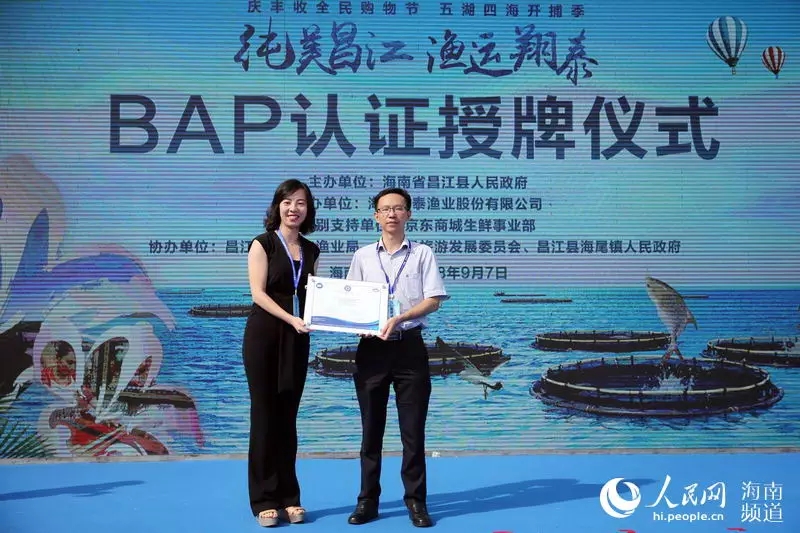 活動(dòng)現(xiàn)場(chǎng),翔泰漁業(yè)和京東生鮮電商平臺(tái)簽署戰(zhàn)略合作協(xié)議,并接受京東生鮮農(nóng)場(chǎng)的授牌,雙方將進(jìn)一步加深合作關(guān)系,持續(xù)為消費(fèi)者帶來健康安全的水產(chǎn)品。同時(shí),GAA(全球水產(chǎn)養(yǎng)殖聯(lián)盟)在現(xiàn)場(chǎng)為翔泰頒發(fā)BAP認(rèn)證證書,這也是GAA所頒發(fā)的第一張金鯧魚國際認(rèn)證最佳水產(chǎn)養(yǎng)殖規(guī)范證書。