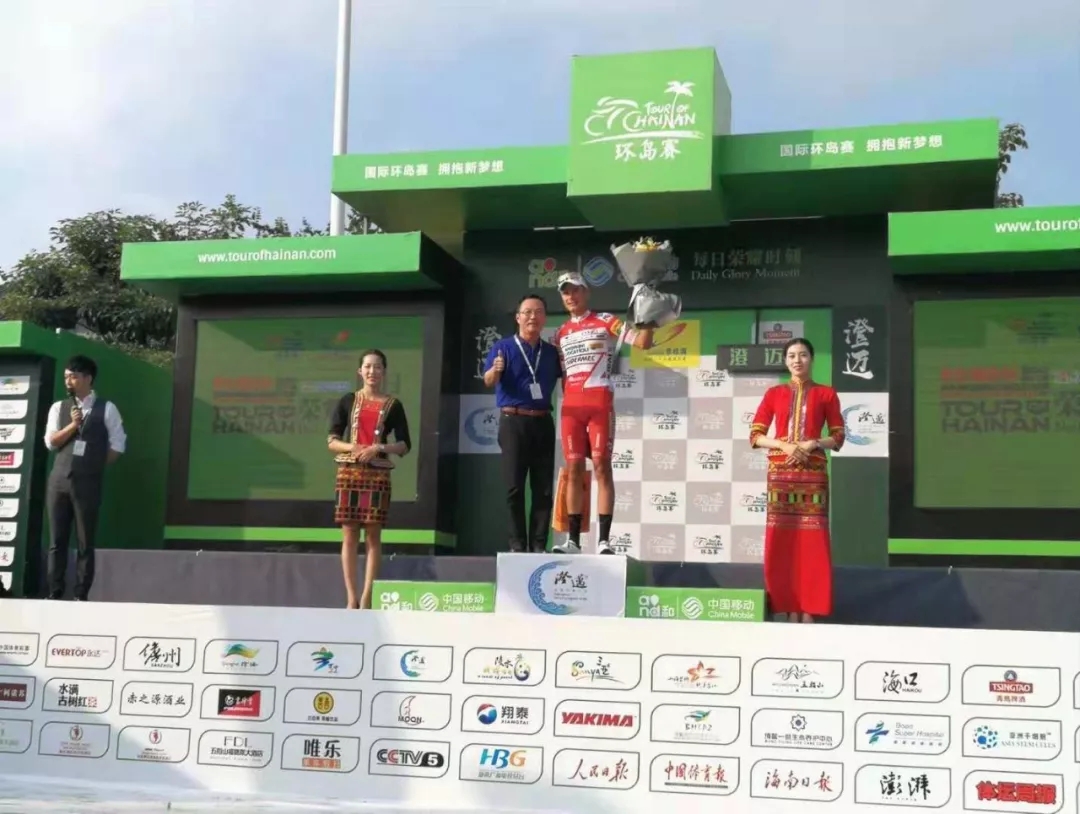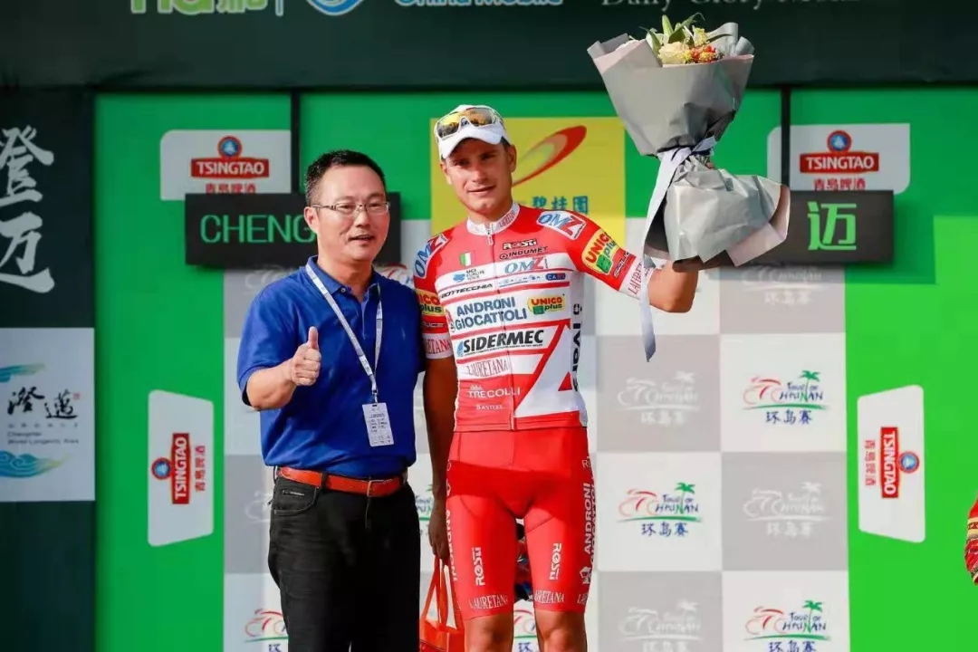 “環(huán)島賽”第二賽段翔泰代表為選手頒發(fā)敢斗獎(jiǎng)