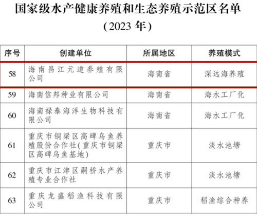 近日,農(nóng)業(yè)農(nóng)村部公布2023年《水產(chǎn)健康養(yǎng)殖和生態(tài)養(yǎng)殖示范區(qū)名單》,翔泰漁業(yè)旗下海南昌江元道養(yǎng)殖有限公司(以下簡(jiǎn)稱(chēng)“昌江元道”)憑借綠色生態(tài)深海網(wǎng)箱養(yǎng)殖模式,獲評(píng)“水產(chǎn)健康養(yǎng)殖和生態(tài)養(yǎng)殖示范區(qū)”!