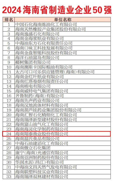 近日,2024海南省企業(yè)100強、制造業(yè)企業(yè)50強、服務(wù)業(yè)企業(yè)50強名單進(jìn)行公示,海南翔泰漁業(yè)股份有限公司入圍2024海南制造業(yè)企業(yè)50強,位列第24名。