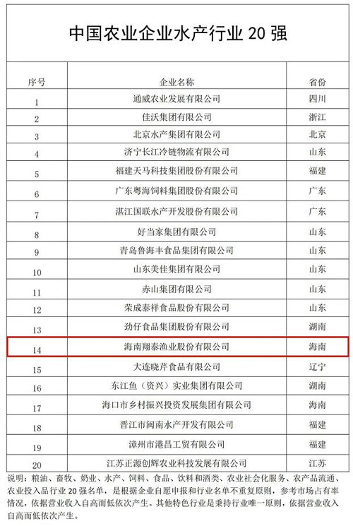 12月11日,農(nóng)民日報社發(fā)布2024中國農(nóng)業(yè)企業(yè)500強(qiáng)榜單。該榜單匯聚糧油、畜牧、奶業(yè)、水產(chǎn)、食品、流通、農(nóng)資等領(lǐng)域頭部企業(yè),海南翔泰漁業(yè)股份有限公司榮耀登榜,并躋身中國農(nóng)業(yè)企業(yè)水產(chǎn)行業(yè)20強(qiáng)。