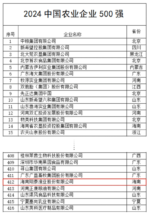 喜報!海南翔泰漁業(yè)股份有限公司榮登2024中國農(nóng)業(yè)企業(yè)500強(qiáng)榜單!
