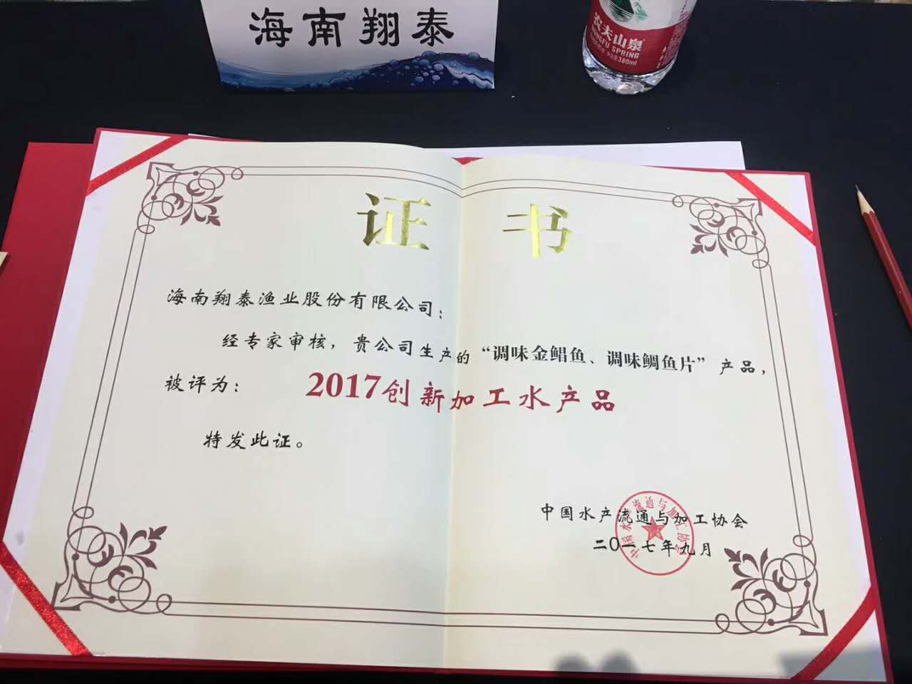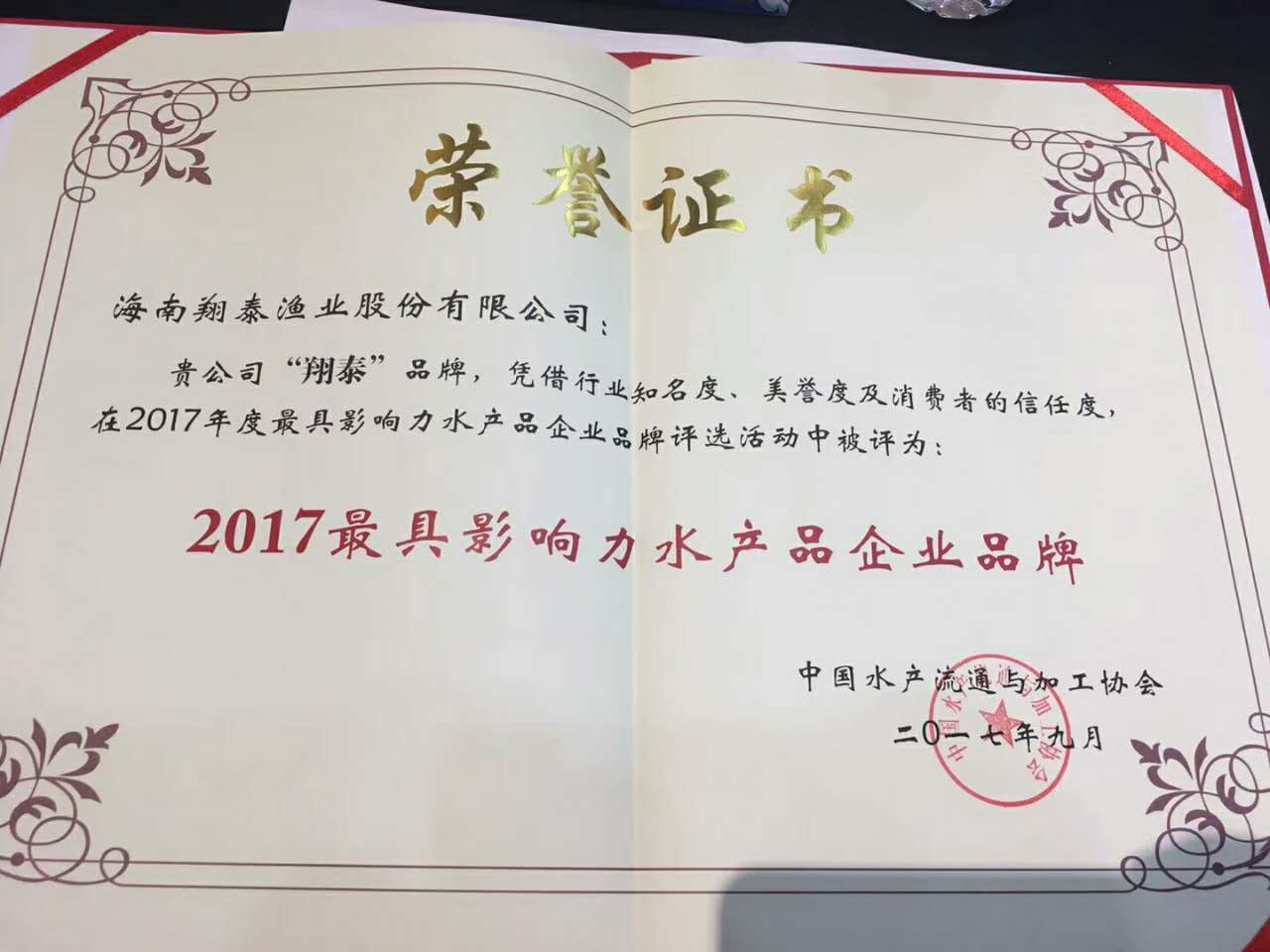 2017年9月,海南翔泰漁業(yè)股份有限公司榮獲“2017最具影響力水產(chǎn)品企業(yè)品牌”、“2017創(chuàng)新加工水產(chǎn)品”兩大證書,這兩大證書由中國農(nóng)業(yè)部、中國水產(chǎn)流通與加工協(xié)會共同頒發(fā)。