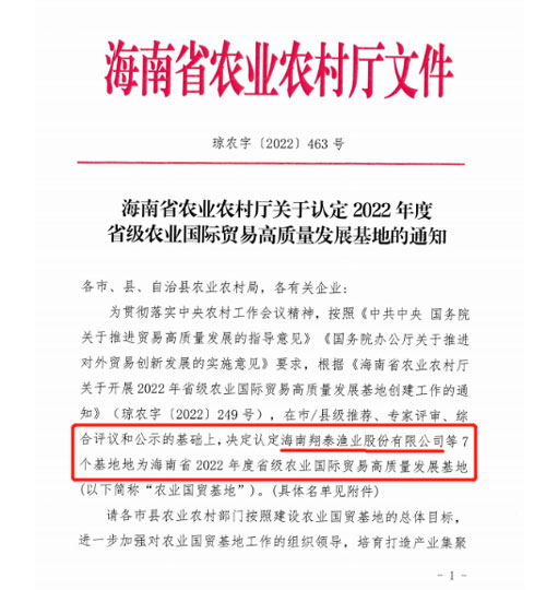 同年,12月28日,海南翔泰漁業(yè)股份有限公司被海南省農(nóng)業(yè)農(nóng)村廳認(rèn)定為海南省2022年度省級(jí)農(nóng)業(yè)國(guó)際貿(mào)易高質(zhì)量發(fā)展基地。