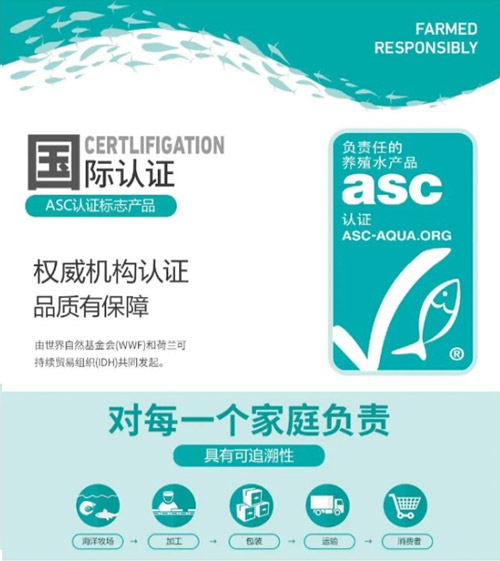 ASC認(rèn)證鼓勵負(fù)責(zé)任的水產(chǎn)養(yǎng)殖行為,要求保護(hù)環(huán)境,關(guān)注水質(zhì),不濫用抗生素,遵守嚴(yán)格的養(yǎng)殖標(biāo)準(zhǔn)。經(jīng)ASC認(rèn)證的產(chǎn)品,可以保證其來自負(fù)責(zé)任的養(yǎng)殖牧場,且從魚苗-成魚-加工水產(chǎn)品-餐桌的全程可追溯,確保將高品質(zhì)產(chǎn)品直接送到顧客的餐桌。