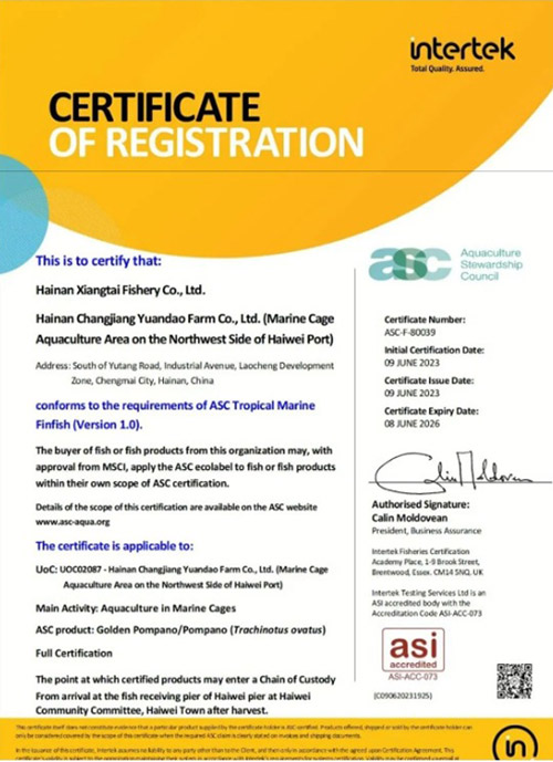 近日,海南翔泰漁業(yè)股份有限公司昌江金鯧魚養(yǎng)殖基地通過歐洲負(fù)責(zé)任水產(chǎn)品ASC標(biāo)準(zhǔn)的各項評審,獲得全球首張ASC金鯧魚網(wǎng)箱養(yǎng)殖認(rèn)證證書。